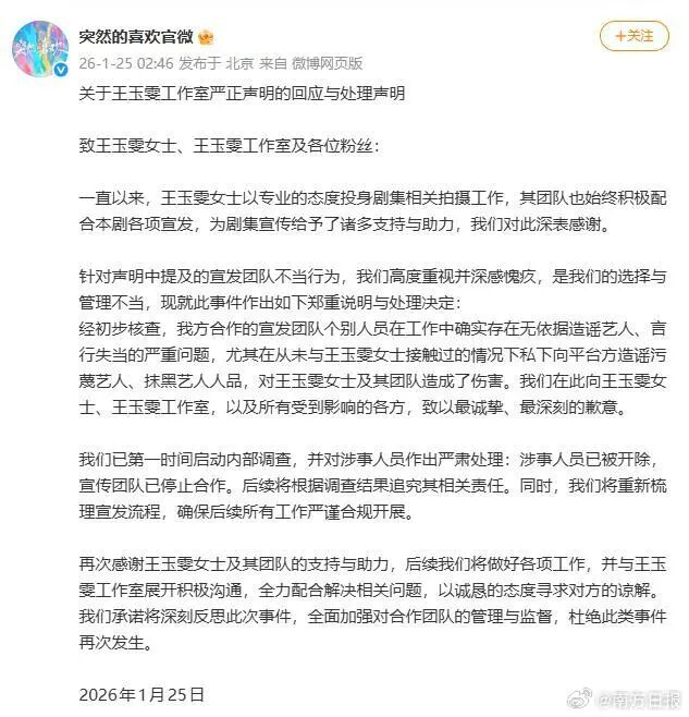 稍后,突然的喜欢官微发文致歉,并确认“经初步核查,我方合作的宣发团队个别人员在工作中确实存在无依据造谣艺人、言行失当的严重问题,尤其在从未与王玉雯女士接触过的情况下私下向平台方造谣污蔑艺人、抹黑艺人人品,对王玉雯女士及其团队造成了伤害。”同时表示,涉事人员已被开除,宣传团队已停止合作。后续将根据调查结果追究其相关责任。