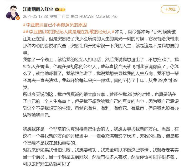 这场从“令狐冲”光环下的出走,不只是一个明星的职业转型,更像是一次关于生命价值的提前“中年觉醒”。在人人追逐高光的时代,李亚鹏却因高光而清醒,因喧嚣而反思。他的选择,撕开了娱乐圈名利表象下关于自我与迷失的永恒命题:当外在的成功与内心的答案背道而驰时,你是否还有勇气,重新出发?