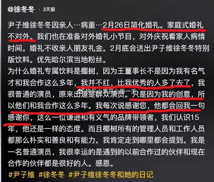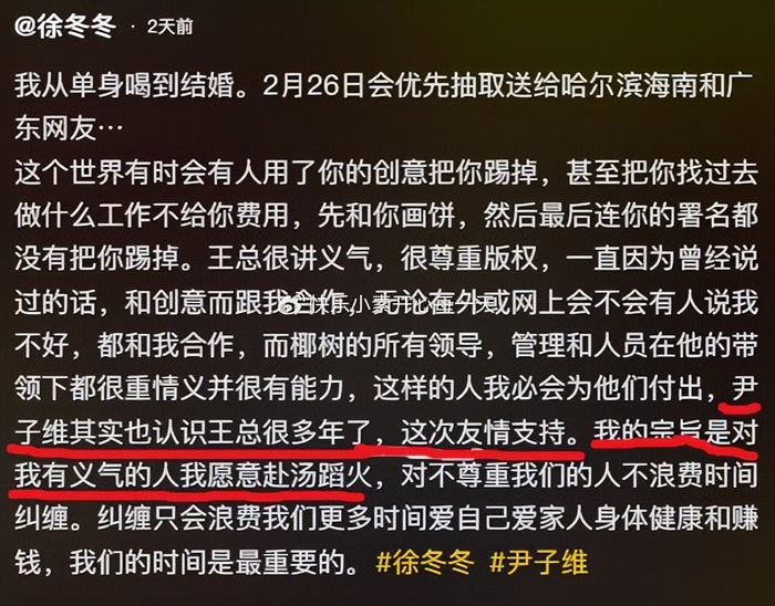 近日,徐冬冬在个人账号接连发声支持椰树品牌。