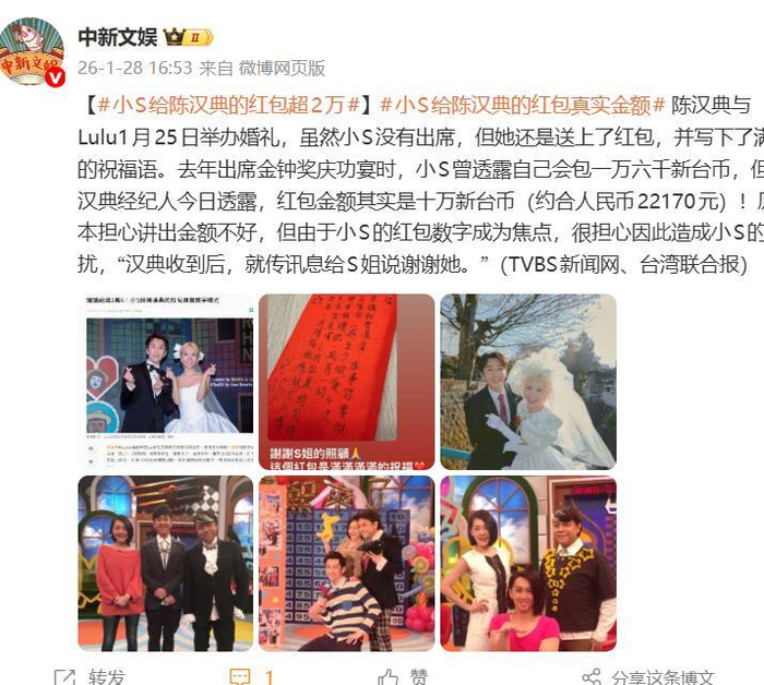 红包背后的数字游戏,则暗藏更多现实考量。早在婚礼前,小S便公开预告礼金为1.6万新台币,理由坦率得近乎“抠门”:许久未正式工作、需负担三个女儿教育开销。她同时清晰界定与陈汉典的关系:“节目上互动亲密,私下仅是普通同事。”然而婚礼后,陈汉典经纪人主动透露实际金额高达10万新台币,并解释澄清缘由:因小S红包数字已成焦点,担心原先说法造成其困扰。这一“补丁”操作,既维护了前辈颜面,也暗合了社会“礼金不宜明盘”的潜规则。