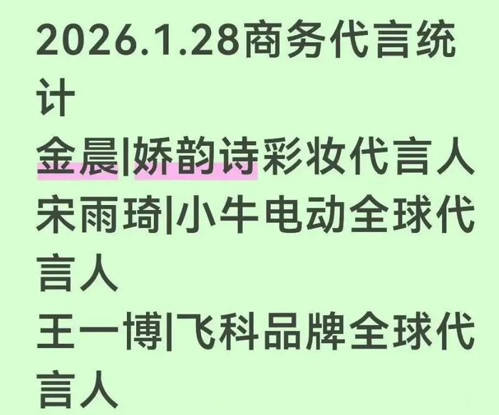 就在狗仔爆料前一天,金晨拿到了彩妆新代言,就金晨的商务资源来说,妥妥的一线女星,虽然都是大使称号,但代言质量相当不错,有车代、奢代、手机代言、平台代言、美妆代言、女装代言等等等等,算上新官宣代言,加起来有十多个,真是闷声赚大钱啊!