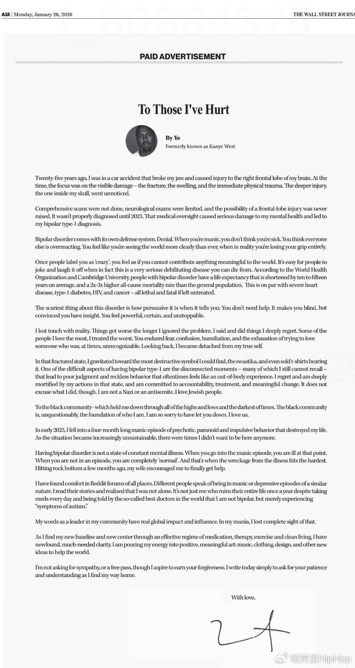 这一次,KANYE WEST买下了《华尔街日报》一个整版,发布了道歉信《致那些被我伤害的人》。