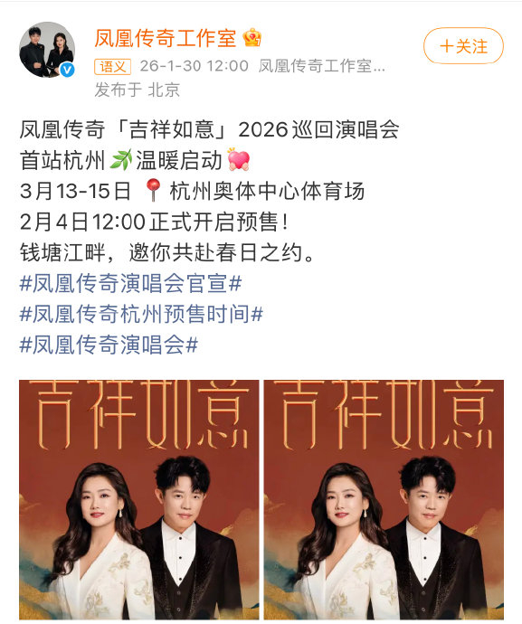 凤凰传奇在2026年1月30日单条微博中同步官宣两大核心事件——时隔半年重启巡回演唱会,并直接公布首站杭州场次的预售时间,瞬间点燃全网歌迷狂欢。