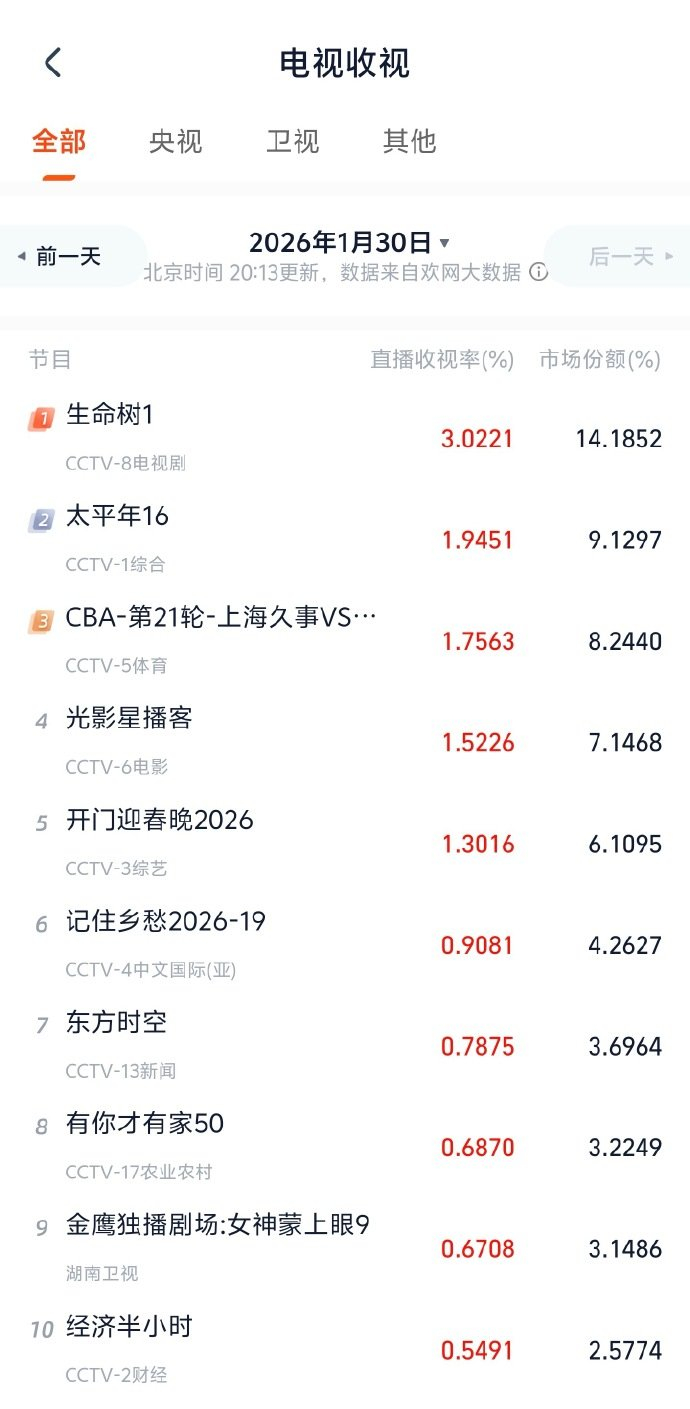 杨紫胡歌新剧生命树首播收视破3 青蕉视频 封面新闻视频官方账号 01.3021:29 关注 【#生命树首播收视破3#】#生命树第一波反馈# 据灯塔专业版数据,由@杨紫 领衔主演,@胡歌 特别出演,@李光洁 、@张哲华1649 领衔主演的《生命树》今日开播,直播收视率已破3。