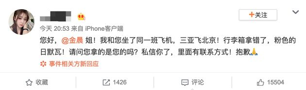 晚间,金晨工作室在社交平台发文回应,称“行李箱已经换回来了,谢谢大家帮忙联系”。