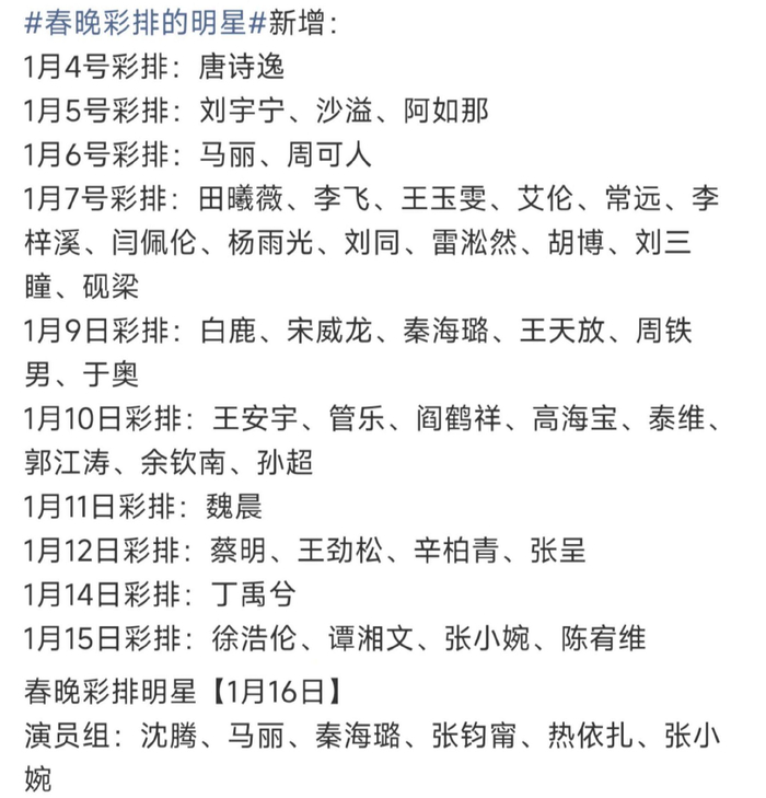 1月25日,第二次联排正式开启,苏有朋、范丞丞、王安宇、胡先煦、姜妍、白鹿、李昀锐、宋威龙、此沙、李兰迪、欧阳娜娜、刘涛、刘敏涛等40多位明星再次登场。新的阵容再次为春晚增添了许多看点,每个人的亮相,都让人充满期待。
