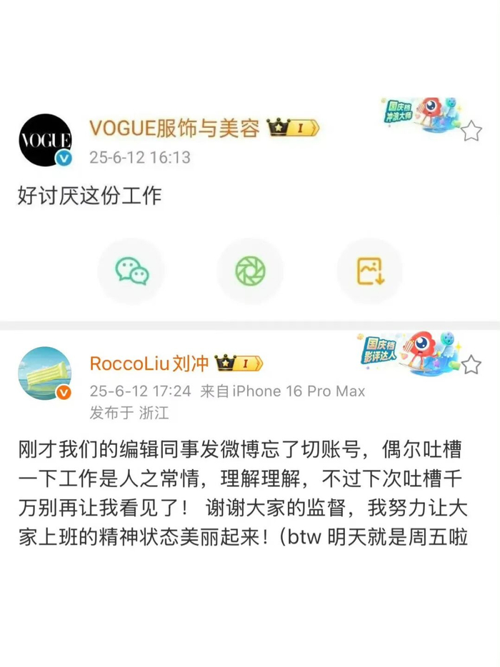 吐槽工作忘切号,《VOGUE》官博发文“好讨厌这份工作”,主编刘冲发文回应
