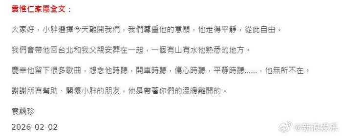 袁惟仁姐姐发文:「大家好,小胖选择今天离开我们,我们尊重他的意愿,他走得平静,从此自由。我们会带他回台北和我父亲安葬在一起,一个有山有水他熟悉的地方。庆幸他留下很多歌曲,想念他时听,开车时听,伤心时听,平静时听他无所不在。谢谢所有帮助、关怀小胖的朋友,他是带着你们的温暖离开的。」