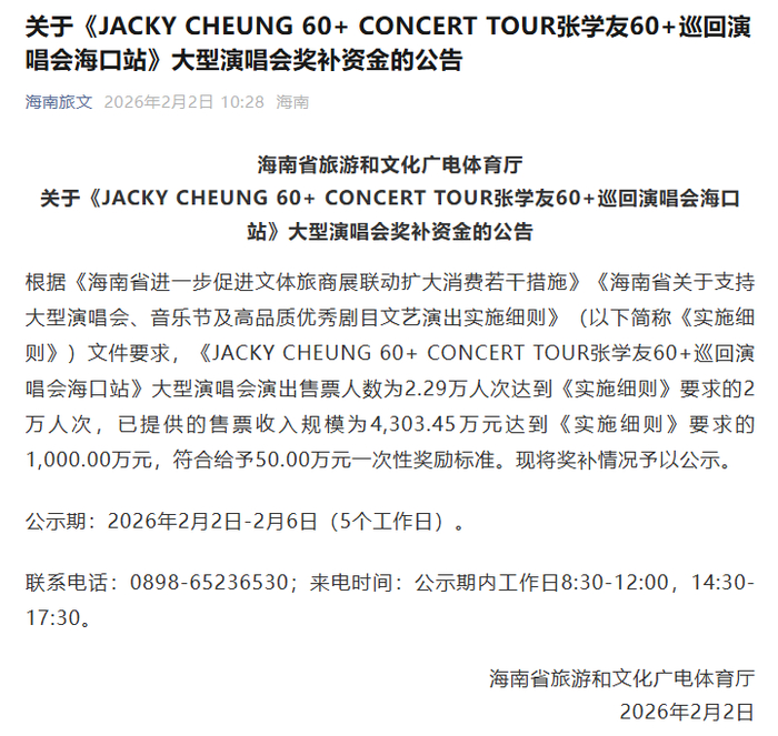 此外,“《JACKY CHEUNG 60+ CONCERT TOUR张学友60+巡回演唱会海口站》大型演唱会演出售票人数为2.29万人次达到《实施细则》要求的2万人次,已提供的售票收入规模为4,303.45万元达到《实施细则》要求的1,000.00万元,符合给予50.00万元一次性奖励标准。”