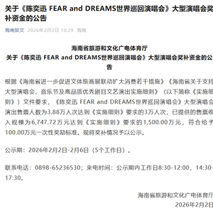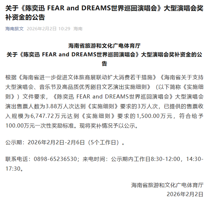 2月2日,海南省旅游和文化广电体育厅发布公示公告称:“根据《海南省进一步促进文体旅商展联动扩大消费若干措施》《海南省关于支持大型演唱会、音乐节及高品质优秀剧目文艺演出实施细则》(以下简称《实施细则》)文件要求,《陈奕迅 FEAR and DREAMS世界巡回演唱会》大型演唱会演出售票人数为3.88万人次达到《实施细则》要求的3万人次,已提供的售票收入规模为6,747.72万元达到《实施细则》要求的1,500.00万元,符合给予100.00万元一次性奖励标准。”