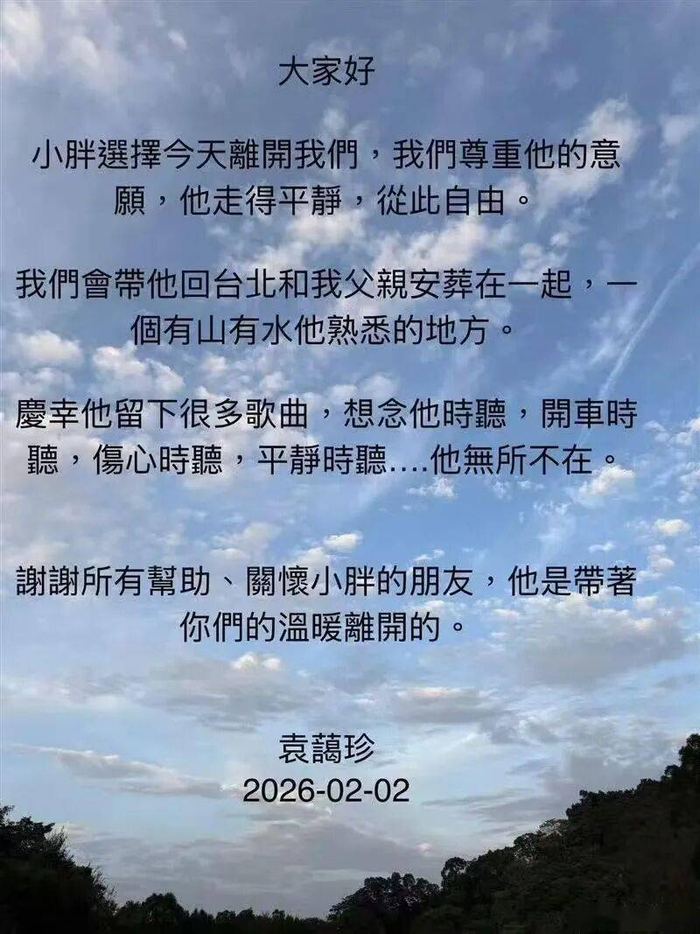 命运却对这位音乐才子格外严苛。2018年,袁惟仁在上海录制节目时意外跌倒,引发脑溢血,手术中竟发现脑部肿瘤。62天的生死拉锯后,他虽奇迹般苏醒,却永远失去了语言能力,这是命运对他的第一次沉重打击。2020年,他在台东家中起身时无力跌倒,头部撞击地面导致昏迷指数降至3分的最低值,经治疗后恢复至6分,却被判定为无认知能力的植物人,从此陷入漫长的沉睡。卧病期间,年迈的母亲与姐姐袁蔼珍不离不弃,日夜照料;好友张宇牵头成立“小胖基金”,游鸿明、巫启贤、陶晶莹等圈内友人纷纷响应,以点滴之力分担沉重的医疗负担,这份跨越岁月的情谊,为艰难时光注入温暖。2025年11月29日,袁惟仁因高烧、排尿异常紧急送医,白血球指数升高提示疑似感染,此后便持续住院治疗,直至2026年2月2日,他带着所有人的思念,平静离去,结束了这场长达八年的病痛煎熬。