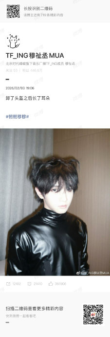 2026年2月,《周五晚高疯》录制现场,穆祉丞卸下铠甲勇士头盔后,刻意将头发打理成双侧翘起的猫耳状,配文调侃:“卸了头盔之后长了耳朵”。这一行为迅速引爆热议:#穆祉丞长了耳朵#登上热搜,硬朗铠甲与萌感猫耳的反差被粉丝称为“小猫铠甲勇士”。