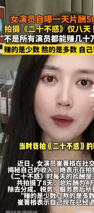 在电视剧《二十不惑》中拍摄八天,总片酬4万元,日薪定格在5000元。这组数字迅速被舆论天平称量:一边是网友犀利对比,“这仍远超普通外卖员月入一万的艰辛”;另一边,则是崔菁格冷静拆解后的现实:扣除经纪公司分成、个人所得税及各类服务费后,实际到手“所剩无几”。她的一句“赚的是少数,熬的是多数”,道出了非头部演员群体的普遍生存状态。这份收入,远非稳定月薪,需要覆盖的却是高昂的隐形成本:不间断的护肤、形体和专业培训投入,以及奔波于各个试镜现场的时间与金钱消耗,最终使她得出一个清醒结论,这个行业对多数从业者而言,与普通职场并无本质差异。