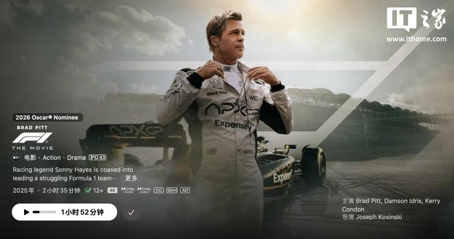参考IT之家此前报道,在 2026 年格莱美颁奖典礼上,苹果 Apple TV 凭借电影《F1:狂飙飞车》,在 4 项提名中中了 1 个,斩获了“最佳乡村独唱表演”奖(Best Country Solo Performance)。这不仅是该片在本颁奖季收入囊中的第 15 个奖项,更为其即将到来的奥斯卡征程注入了强心剂。