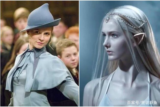 芙蓉不用说了,书中的第一美女,魅娃的后代。个人感觉这个饰演芙蓉的演员有点拉跨,其实演员本身不丑,但是因为书中对芙蓉的描述太美了。“一头长长的瀑布似的银亮头发垂到她的腰际。她有一双湛蓝色的大眼睛和一口洁白整齐的牙齿。”在圣诞舞会中对芙蓉的描写是“她穿着银灰色的缎子长袍,真是美艳惊人”。饰演者克蕾曼丝·波西离我心目中的芙蓉差距有点大,下图中右边的女精灵更符合书中描述魅娃后代的样子。