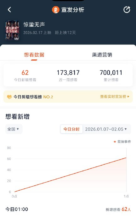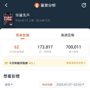 正面迎战吴京武侠片《镖人》、沈腾喜剧《飞驰人生3》。《惊蛰无声》以差异化题材破局,猫眼“想看”人数已破70万,业内预测票房有望冲击40亿。