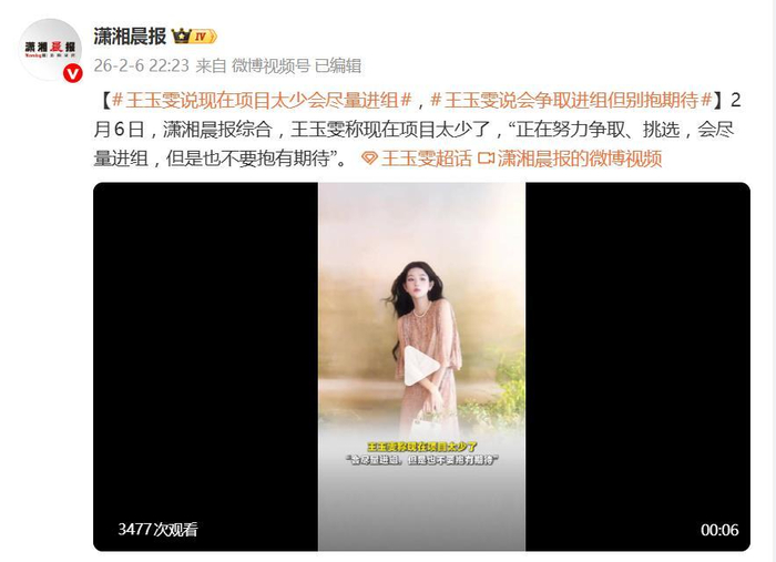 王玉雯称现在项目太少了,会争取进组但别抱期待