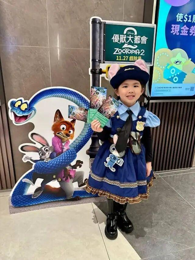 小宝贝身穿全套蓝色警服,头戴长长的兔耳朵,站在电影宣传板前手持电影票拍照,造型惟妙惟肖,加上精灵活泼的表情,可爱十足,被网友大赞是“迷你版朱迪”,“妹妹好可爱”。