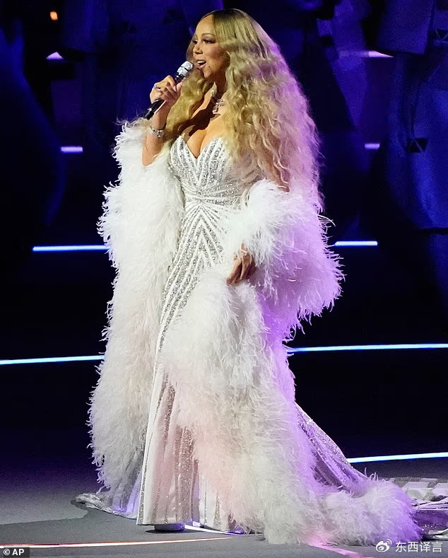 在这场光影交错,色彩斑斓,动感十足,音乐贯穿始终的盛会上,美国老牌女歌手玛丽亚·凯莉(Mariah Carey)登台献唱,在全场的注视下,现年56岁的“牛姐”身披白色羽毛披肩惊艳亮相,银色的晚礼裙在灯光的照耀下颇为璀璨。