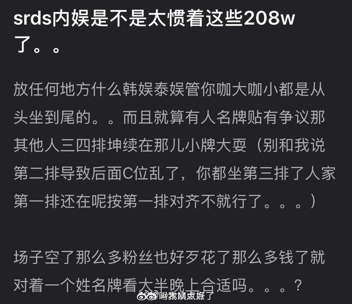 网友质疑内娱明星微博之夜缺席,粉丝对姓名牌空坐整晚 木M点点 02.0706:25 关注 微博之夜过后有网友问内娱是不是太惯着这些208w了?放任何地方什么韩娱泰娱,管你咖大咖小都是从头坐到尾的,场子空了那么多,粉丝也好歹花了那么多钱了就对着一个姓名牌看大半晚上合适吗?