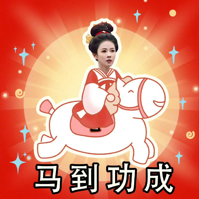 为宣传古装探案剧《唐宫奇案》,白鹿结合剧中角色“李佩仪”的骑马戏份,设计出“马到功成”谐音梗表情包。她双手模拟扬鞭策马姿态,辅以挑眉、咧嘴的夸张表情,将“仪马当先”(谐音“一马当先”)的祝福语具象化。这一创意既呼应角色英姿飒爽的形象,又以接地气的方式传递新春祝福,被剧迷称为“年度最实用贺岁图”。