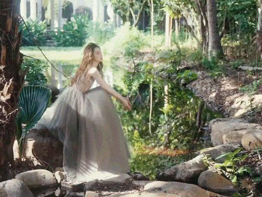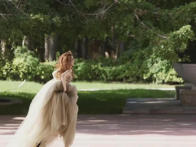 她拍摄了一组绿色蓬蓬裙婚纱的视频,在丛林深处,有树叶有流水,到处都是春天的气息。