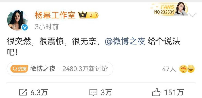 当晚20时许,杨幂工作室官方微博直接发声回应,以“很突然,很震惊,很无奈”三词表达立场,同时公开@微博之夜 官方账号,明确要求“给个说法吧”。该条动态发布仅一个多小时,便收获145万+网友点赞,评论区涌入大量杨幂粉丝与路人网友,纷纷要求主办方核查网传座位图来源,还原事件真相,杜绝艺人无辜承担争议舆论。