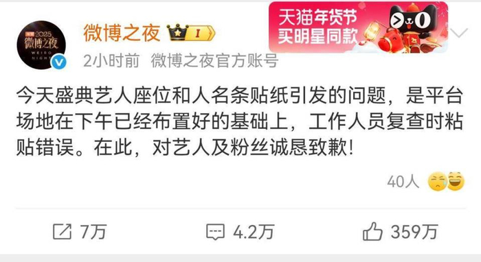 在舆论持续发酵、盛典现场秩序受影响的情况下,当晚9时22分,@微博之夜 官方账号紧急发布致歉声明。公告中明确说明,此次艺人座位与人名条贴纸问题,系场地在下午完成全部布置后,工作人员复查环节出现粘贴操作失误所致,并非前期规划调整,官方就此对涉事艺人及双方粉丝致以诚恳歉意。致歉微博发布后,短时间内点赞量突破300万。主办方在发布声明的同时,已对现场座位与人名条进行紧急复原调整,盛典后续流程得以平稳推进。