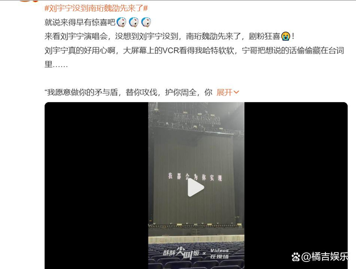 作为少有的“影视歌三栖”均衡发展的艺人,刘宇宁的演唱会从策划阶段就显露出对多重身份的巧妙融合。据现场粉丝透露,视频中魏劭的片段实为《南珩记》未公开素材,剧组特意为演唱会剪辑了专属版本。弹幕台词“此战必胜”与刘宇宁现实中的成名曲《让酒》前奏无缝衔接,弹幕瞬间刷屏:“演员粉和歌手粉今晚集体过年!”这种打破次元壁的互动,恰好印证了他“双栖顶流”的号召力——微博话题#刘宇宁深圳演唱会#阅读量一夜破亿,其中“魏劭出场”相关片段转发量占比超40%。