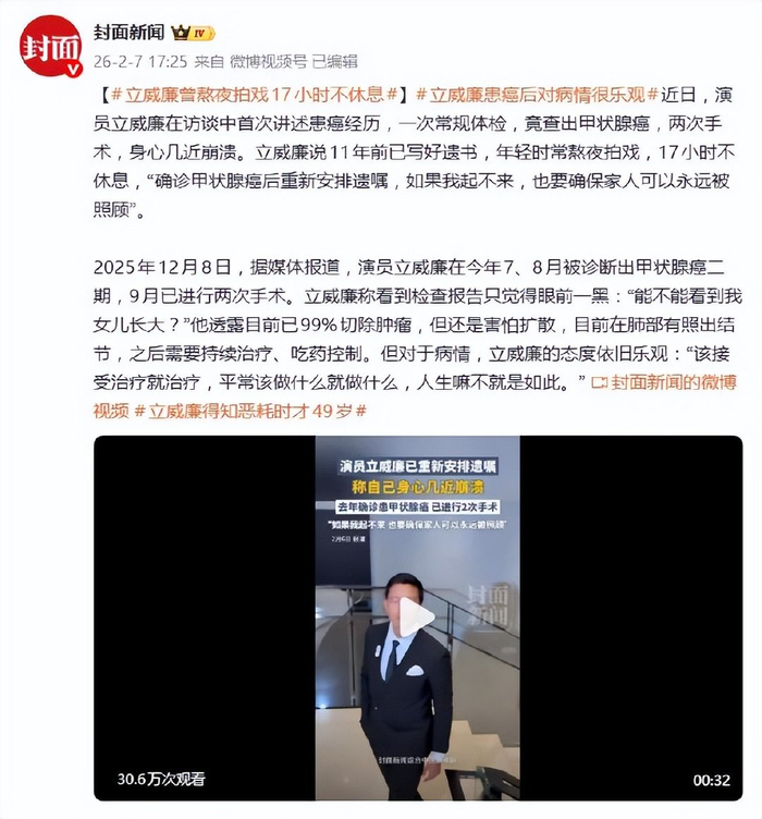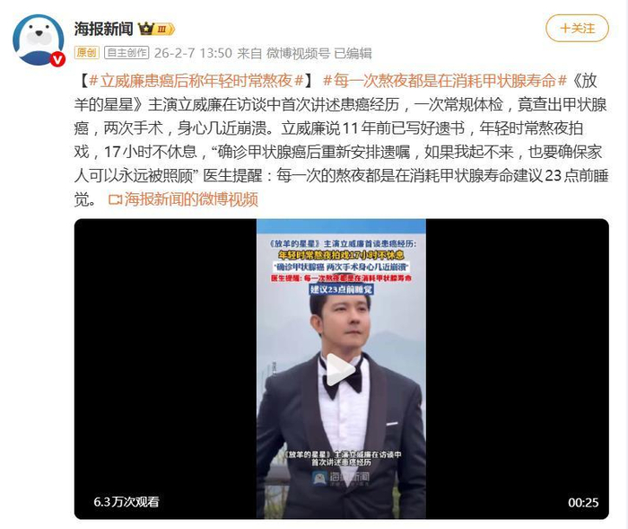 一则关于“偶像剧王子”立威廉患癌的消息,最近在网络上引发了不小的震动。这位曾主演《放羊的星星》等经典剧集的演员,在访谈中首次详细讲述了确诊甲状腺癌二期的经历,其背后“连续工作17小时”、“熬夜成常态”的往事,更是戳中了许多当代打工人的健康焦虑。