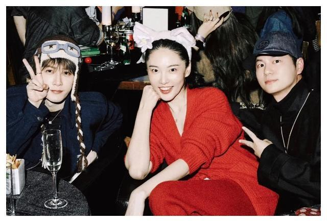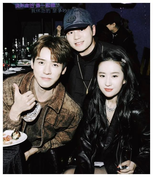 第一张,是网友和刘亦菲、龚俊的合影。其中刘亦菲头发上夹了一个头饰,手里端着酒杯,笑容甜甜的,美得让人挪不开眼睛。龚俊竖起了大拇指,帅的。
