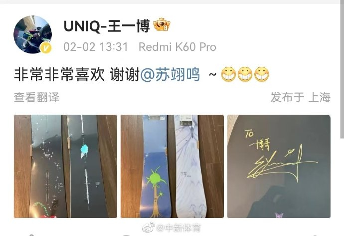 2023年2月,苏翊鸣将定制滑雪板赠予王一博,板身清晰标注"TO一博哥"的亲签文字。王一博不仅微博晒出礼物致谢,更主动关注苏翊鸣账号。这份承载专业认可的礼物成为两人友谊的实体象征,也埋下后续合作伏笔——两年后王一博在哈尔滨亚冬会官方主题曲《点亮亚洲》MV中特意选用此板拍摄,用行动诠释珍视。