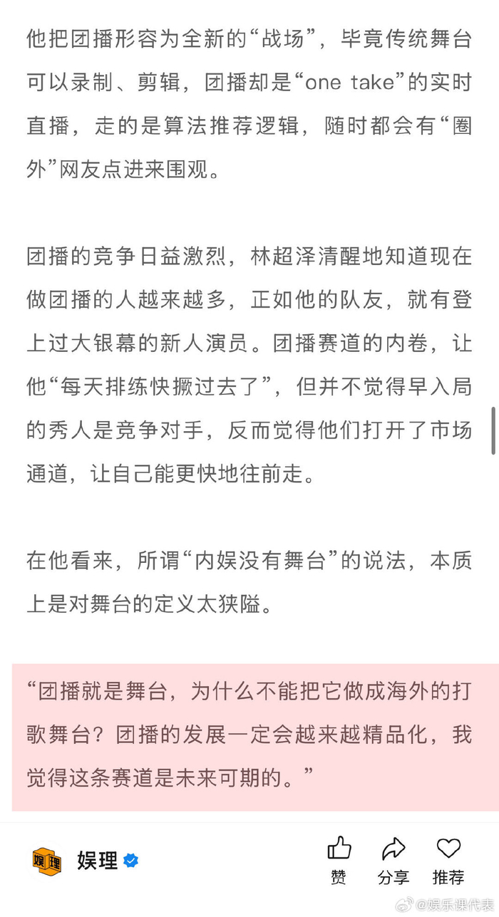 #刘冠佑回应被说做团播可惜了# #林超泽回应团播为了赚快钱# 官宣团播时,不少人疑惑“明明可以更好,为什么要做这个”。粉丝则担心当年护送出道的爱豆褪去“神秘感”。但在@刘冠佑Neil 看来:“没人规定艺人一定要远在天边…很多艺人跟粉丝、跟观众之间没有那么强的距离感,也是很亲近的。”#刘冠佑林超泽谈爱豆做团播#↓