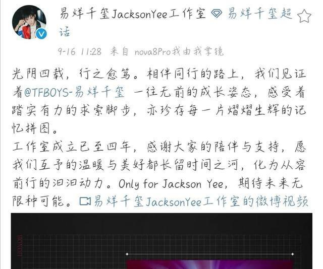易烊千玺的工作室成立四周年了,这四年来千玺的事业蒸蒸日上,工作室也将千玺这四年的成长和成就都记录了下来,很用心了。
