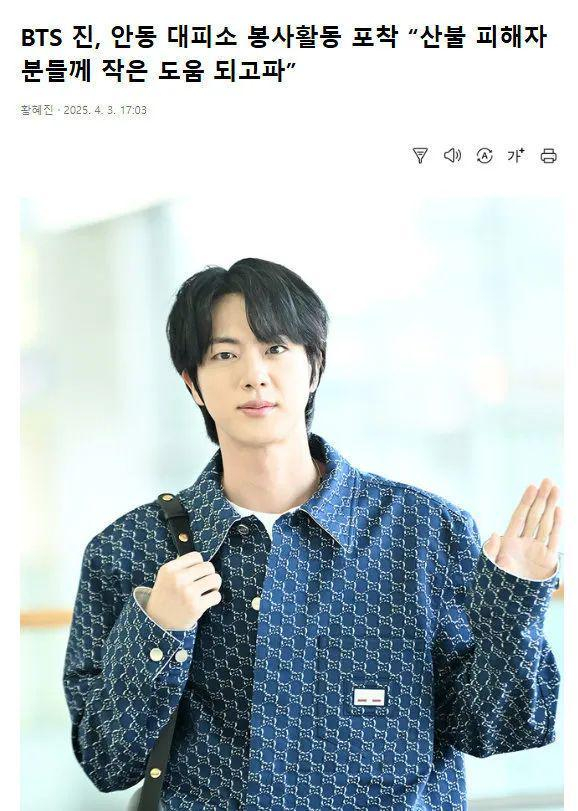 4月3日,经纪公司Big Hit Music向媒体表示:“为了向遭受山火灾害的民众提供力所能及的帮助,JIN决定参与志愿活动。”