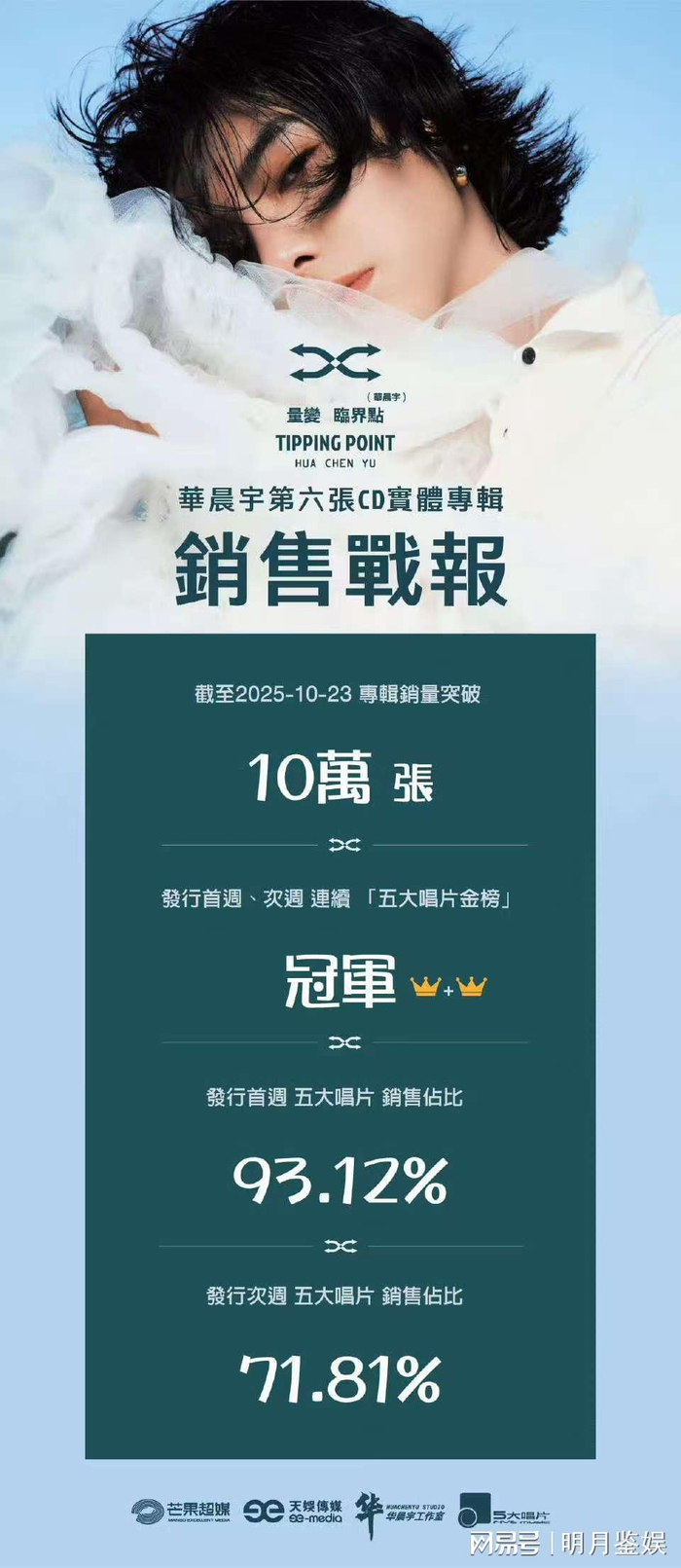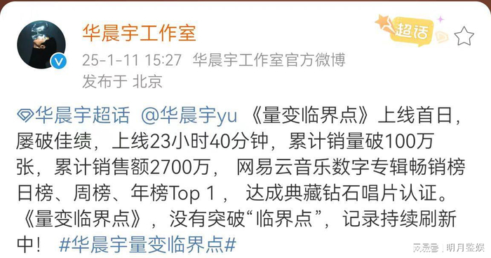除了这些奖项,这张在年初发布的包含对生命本质的剖白,对灵魂音乐的再创作的《量变临界点》,在上线23小时40分后,累计销量突破100万张,累计销售额2700万。线下数据也非常可观,实体专辑CD版在发行首周、次周连续夺冠[5大金榜榜首],总销量突破10万张