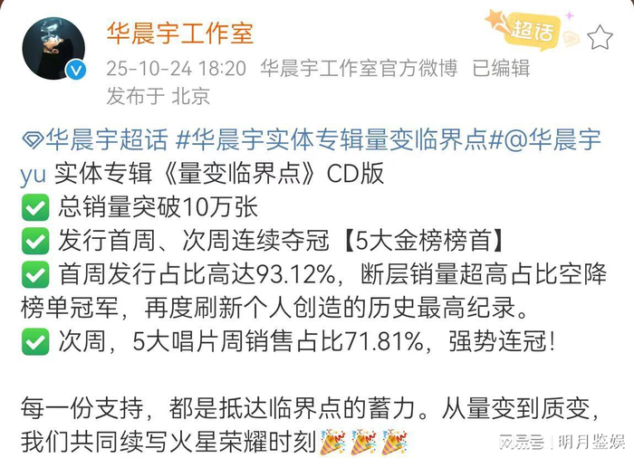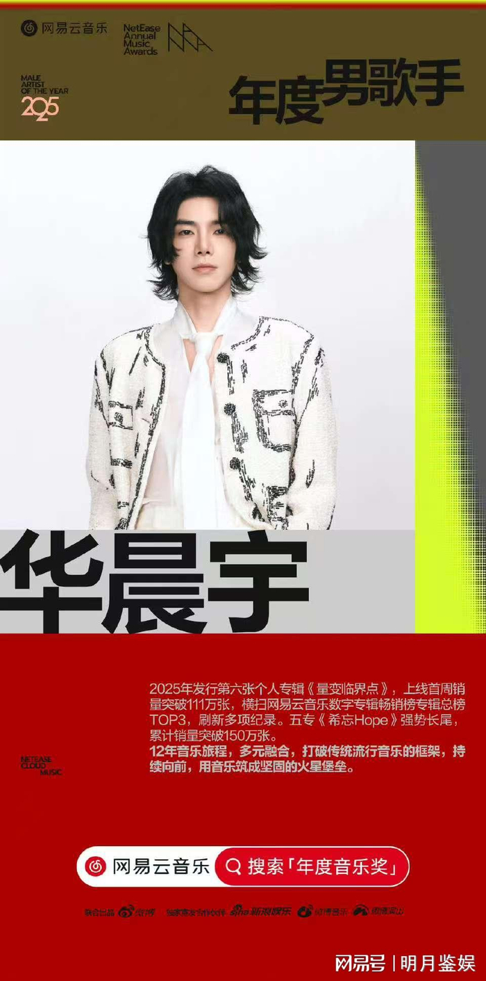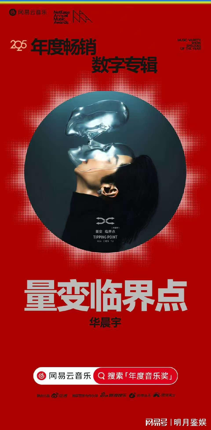华晨宇通过专业的音乐知识、独特的音乐风格以及他对音乐与人、与世界的关系的思考创作的第六张专辑《量变临界点》,在网易云音乐2025年度音乐奖中荣获多重桂冠,其中包括[年度华语专辑]、[年度热门专辑TOP1]、「年度畅销数字专辑TOP1]