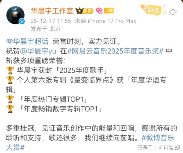 2025年的时光已然走进末尾,而我们熟悉的旋律,帮助我们记录了难忘的回忆。网易云音乐2025年度音乐奖已公布,其中获封2025年度最佳男歌手的华晨宇,在这次的年度音乐奖中荣获多重桂冠。