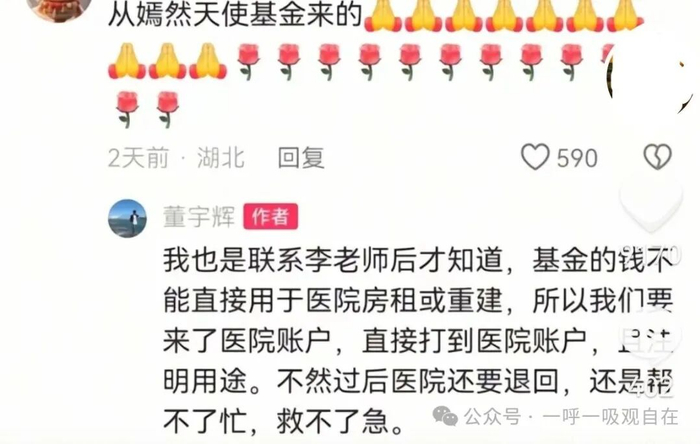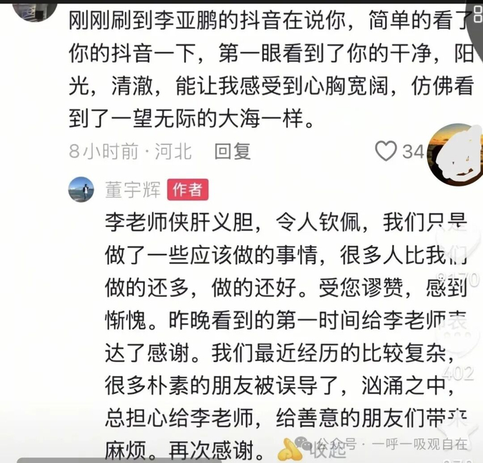 一位粉丝留言道:“我是鹏哥铁粉,看到他提到董宇辉老师很感动,特意来点赞。”董宇辉则回复:“亚鹏老师谬赞。能为嫣然、为公益做一点事,是我们共同的心愿。”