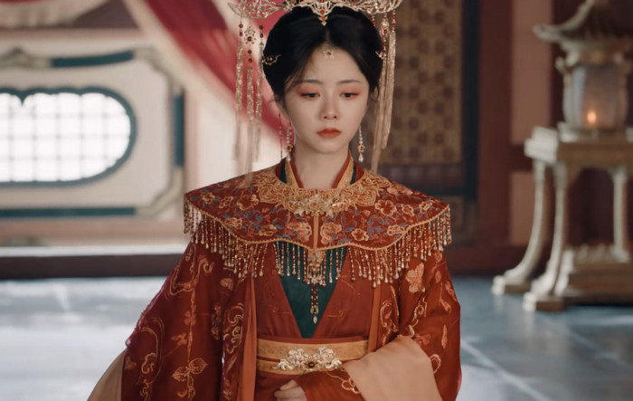 一身红色长裙,裙摆曳地,领口和袖口绣着金线暗纹,头发梳成繁复的发髻,插着玉簪,妆容浓艳,眉峰微挑,眼神决绝。