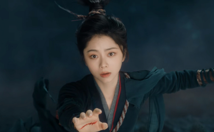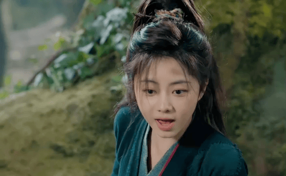 肖瑶的妆造走清新灵动路线,一身浅青色短打裙,裙摆绣着细碎的草木纹样,既方便行动又透着少女感,头发简单束成高马尾,用浅色丝带系着,跑动时马尾飞扬,满是活力。
