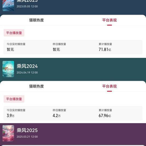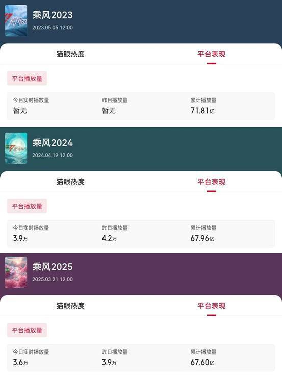 2023年其累计播放量还有71.81亿,到2024年降至67.96亿,去年为67.6亿。虽下降幅度不大,但仍在走下坡路。