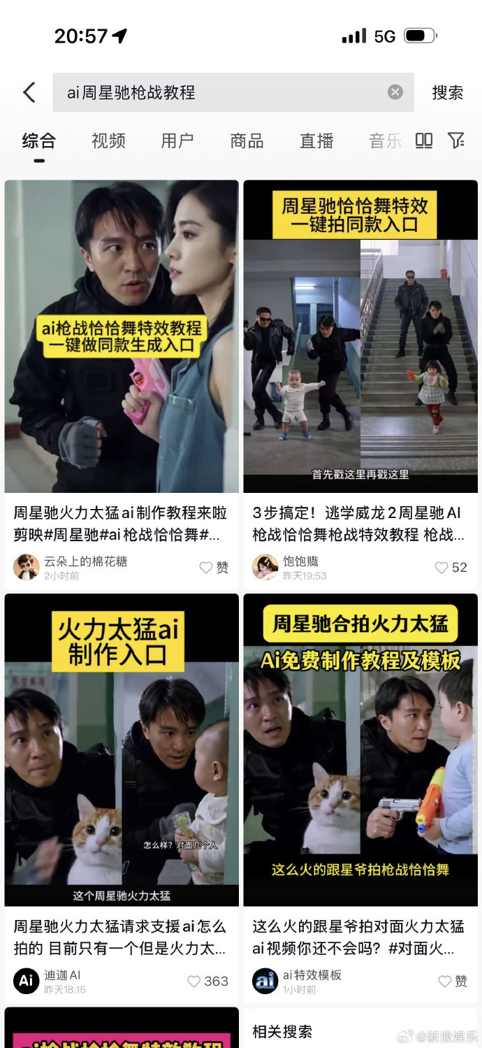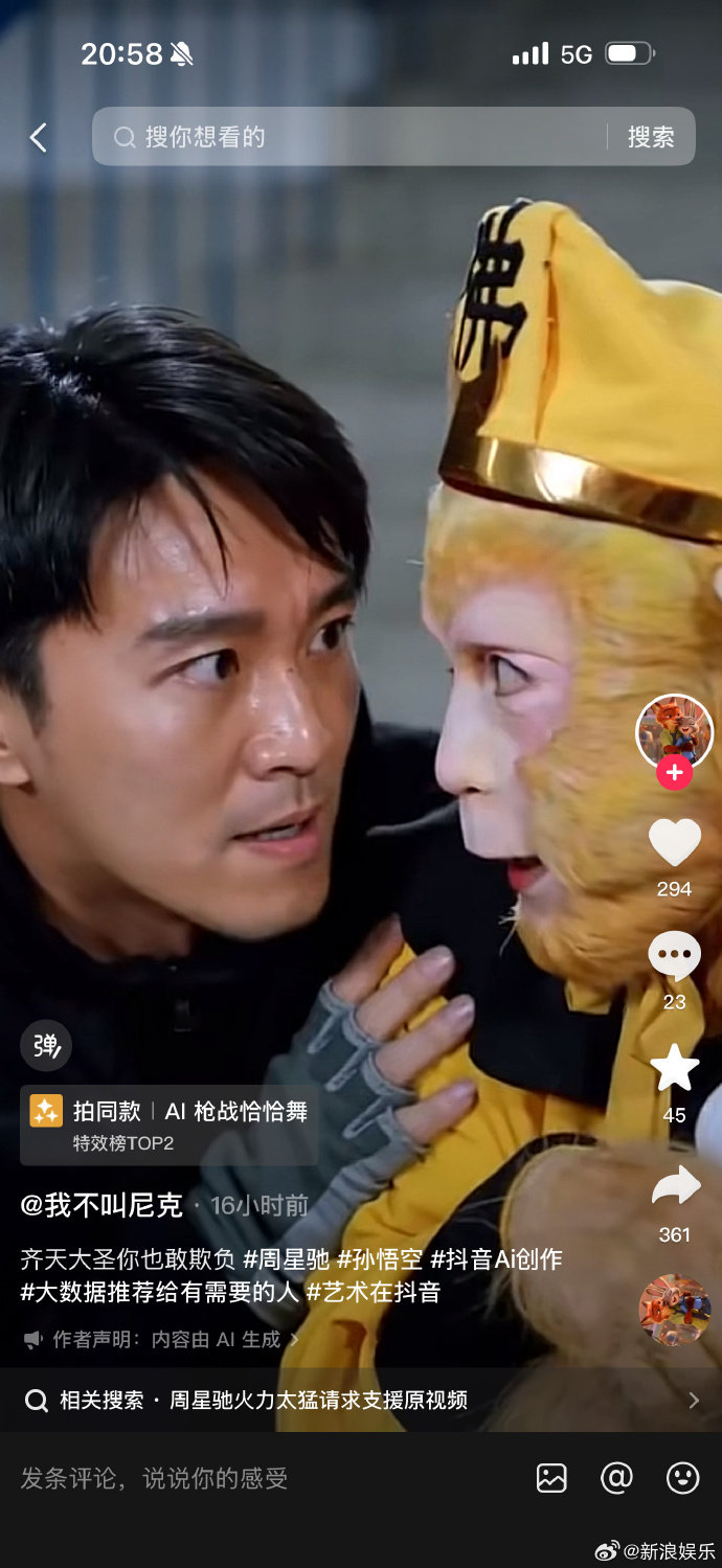 这可不是简单的粉丝二创。陈震宇展示的截图中,AI生成的“周星驰”正跳着枪战恰恰舞,或是化身齐天大圣,形象逼真,动作流畅。这些名为“AI枪战恰恰舞”、“周星驰AI合影一键生成”的特效,一度冲上平台特效榜TOP2,吸引了超过89万人使用。尽管创作者标注了“内容由AI生成”,但从头到尾没提是否获得了周星驰本人的授权。