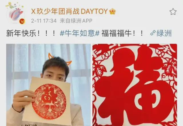 下图是肖战2021年送出的新春祝福!“牛年如意,福福福牛!”牛年新春,肖战晒出的是福字剪纸和拿着剪纸的自拍照。
