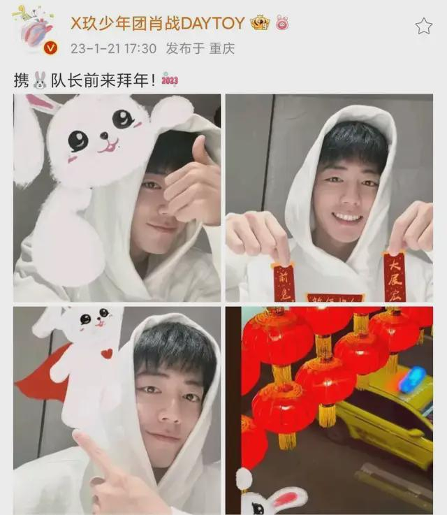 2023年是兔年,肖战送出祝福,文案是:“携兔子队长前来拜年!”