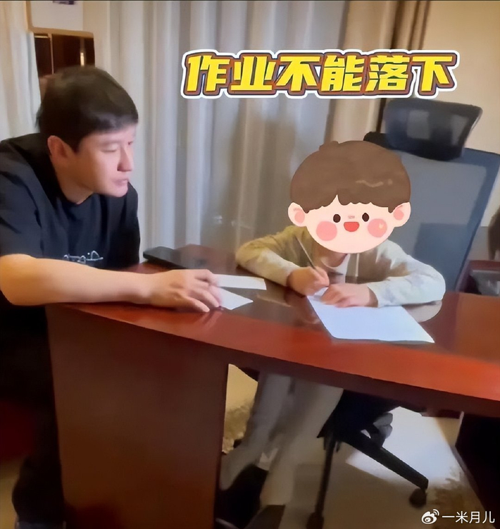 父子俩的相处细节格外真实可爱,小海绵身高已到黄晓明胸口,比上次露面明显长高,站在父亲身边像个“小王子”。父子一起玩五子棋时,小海绵输了便耍赖,扑在棋盘上“吃”棋子,上演“掩耳盗铃”的小调皮,黄晓明则看着儿子,也是满满的宠溺了,玩耍过后,黄晓明还陪小海绵写作业,自己也拿着笔和本子同步书写,用“以身作则”诠释着父亲的责任,耐心又温柔。