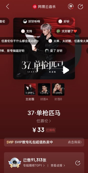 任嘉伦新专辑《37·单枪匹马》上线后的销售成绩和榜单表现如何?
