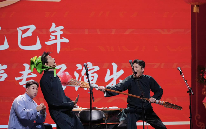 舞台上的欢笑与感动交织,新老演员的碰撞更显生机。孟鹤堂与周九良的《爽剧巨爽》精准捕捉职场痛点,密集的包袱引发全场共鸣;秦霄贤在《谁是主角》中延续“人傻钱多”的幽默人设,返场时甚至向观众抛撒人民币,调侃“大过年的别白来”,尽显年轻一代的活力。而郭麒麟与阎鹤祥、郭德纲合演的《单身保卫战》,则用“假订婚收份子”“达芬奇未婚案例”等妙语,巧妙回应了外界的催婚关注,父子同台的画面尤为珍贵。