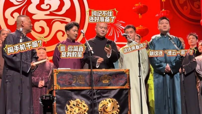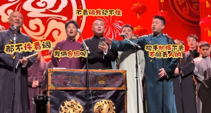 开场门柳环节,郭德纲率全体演员齐唱《发四喜》。 但这次不是郭德纲领唱,因为他的嗓子已经充血沙哑。 他把领唱任务交给了郭麒麟、岳云鹏、陶阳和张鹤伦四人。 结果岳云鹏一边唱一边看手机歌词,唱着唱着还退了下去,被张鹤伦出手把手机拍了下去。 郭麒麟赶忙找补说“我俩合影呢”,台下笑成一片。 这让人想起多年前那个“翻车版”《画扇面》,德云社的“翻车小曲”又多了一首《发四喜》。