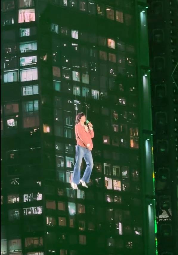 湖南卫视跨年晚会上,王一博吊威亚唱歌,在空中展现高难度动作。